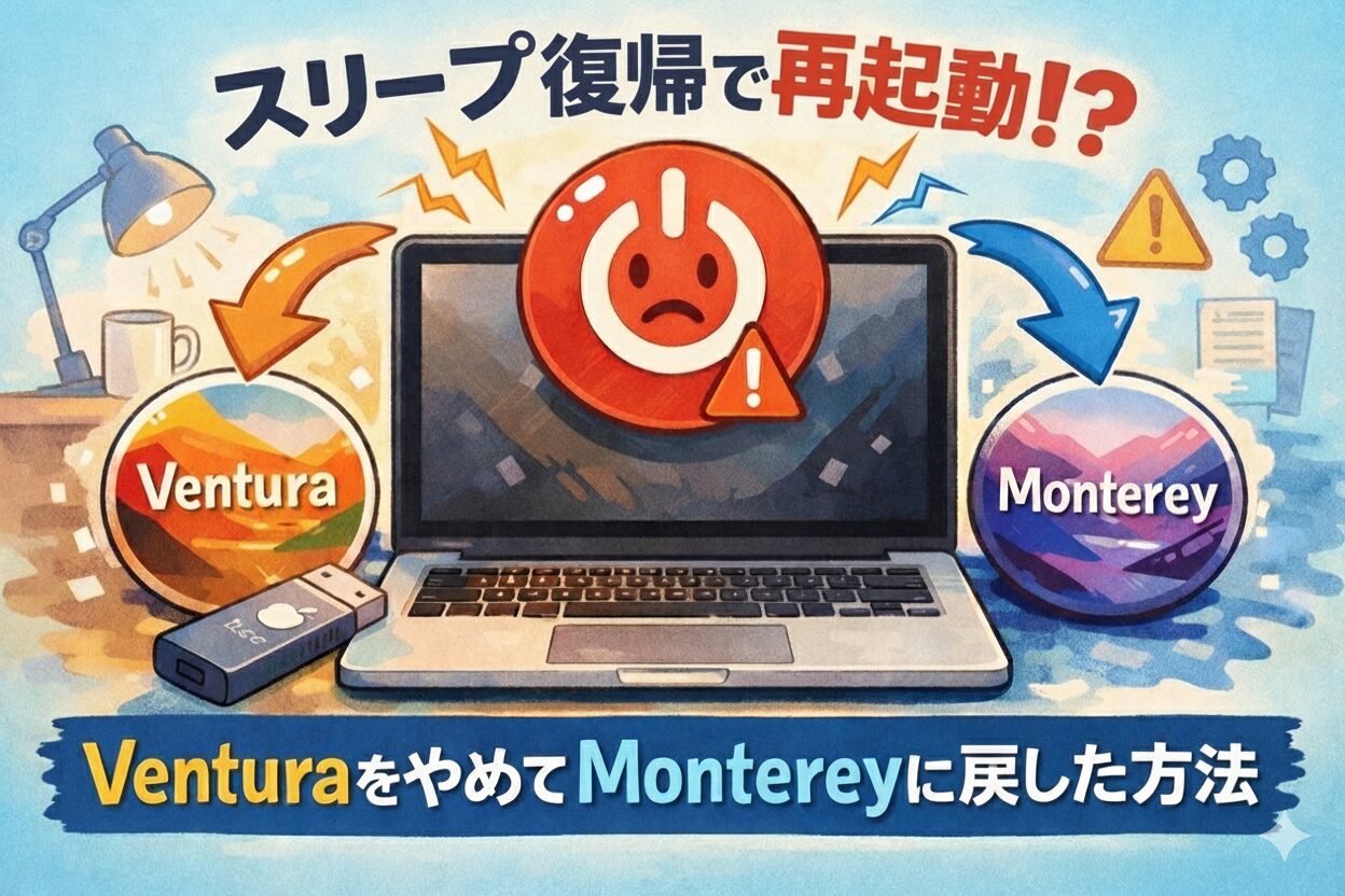 macOS Venturaで不安定になったIntel Macを、Montereyへ戻して安定させた実体験を、 具体的な手順と、正直な失敗談を交えてまとめています。
